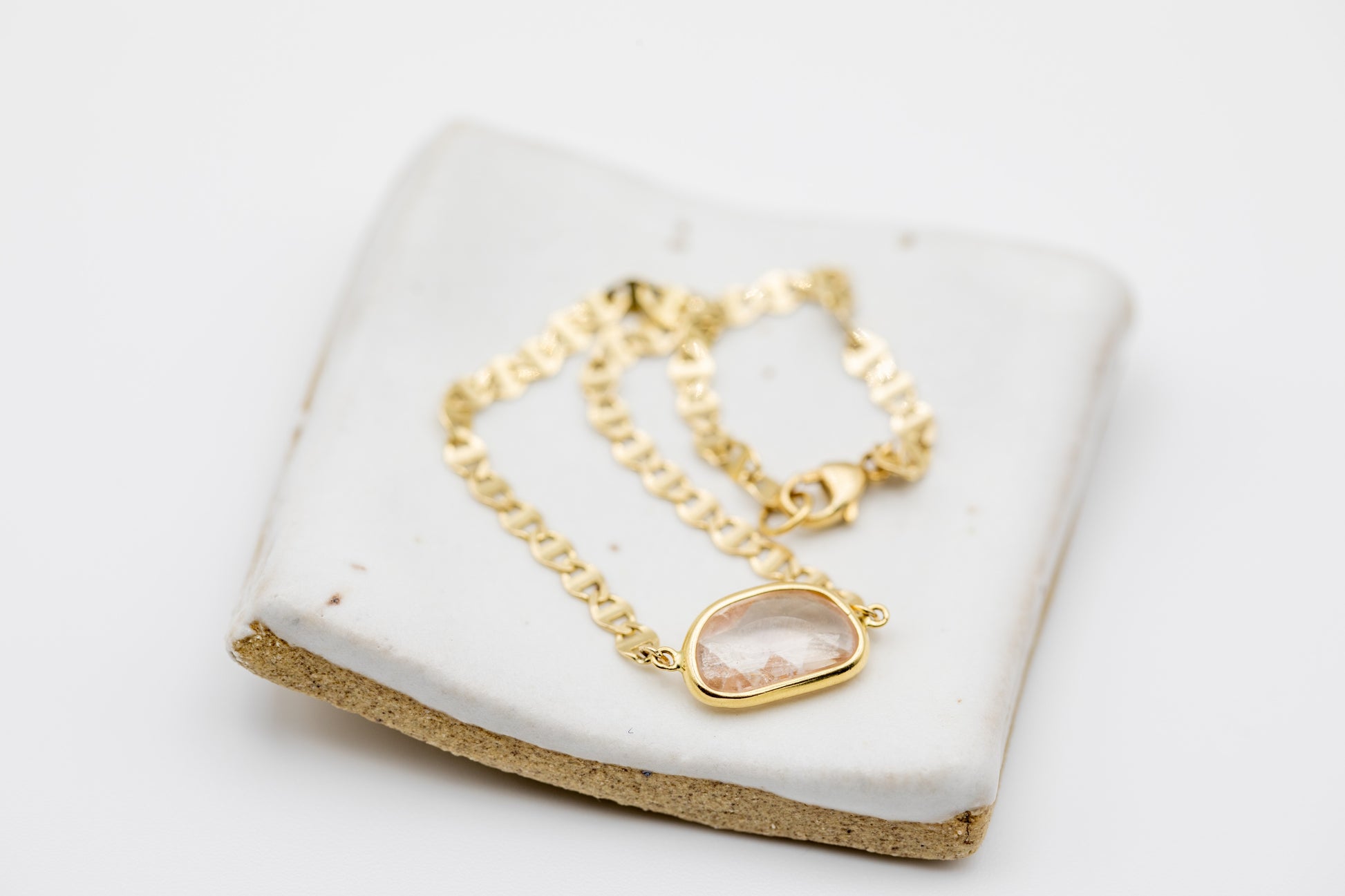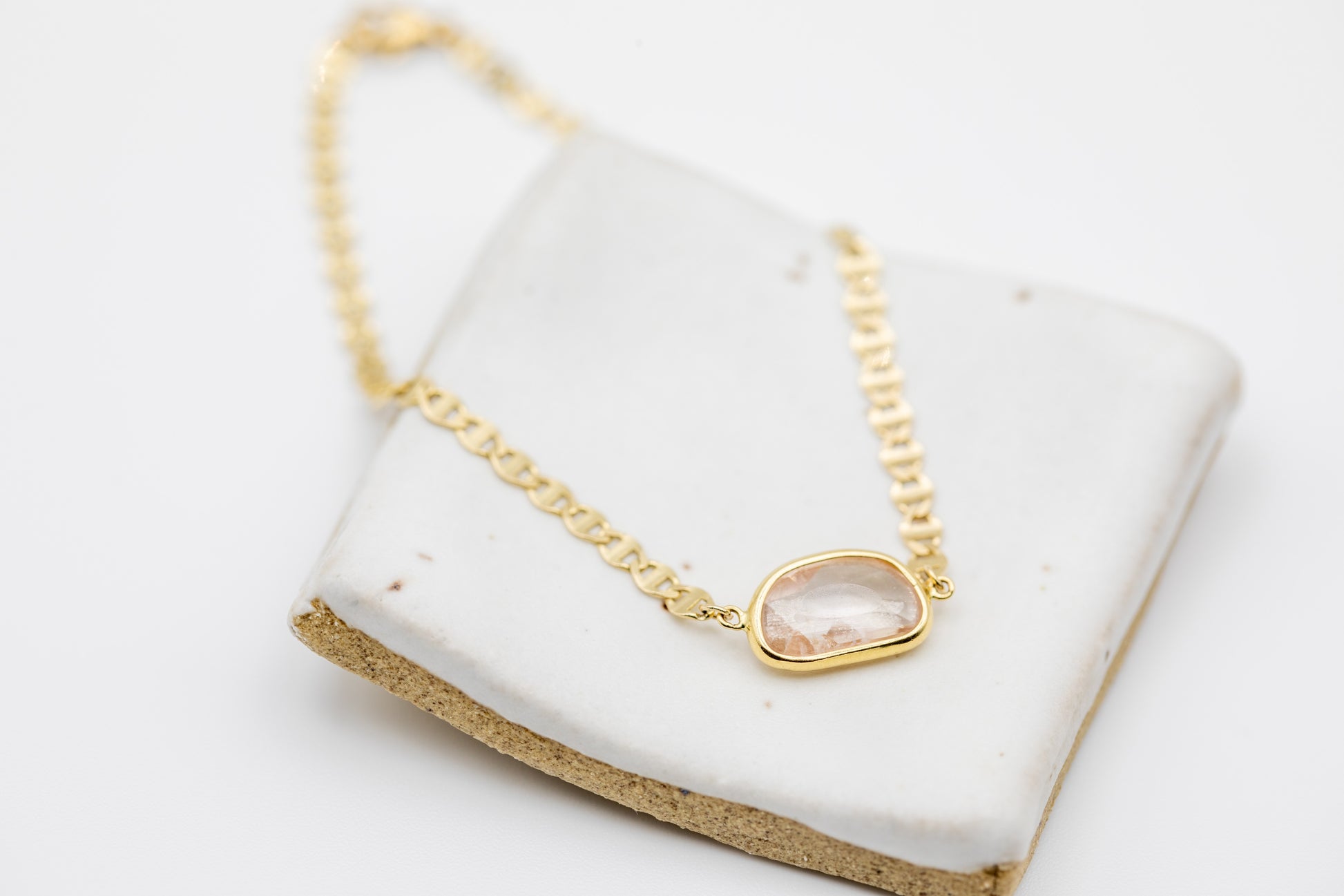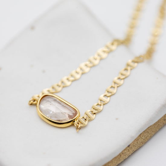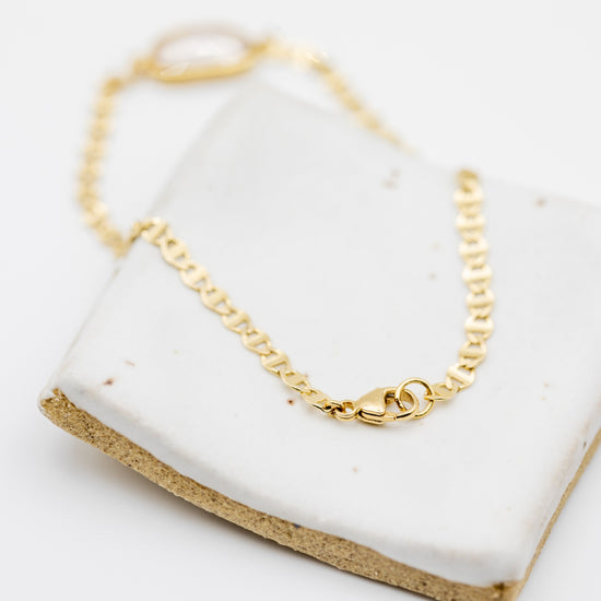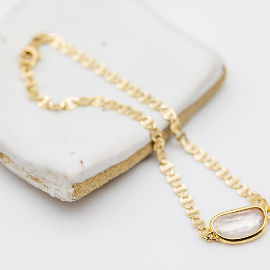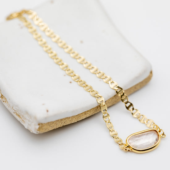 A unique and striking piece, the Aura Slice Bracelet features a one-of-a-kind, jelly bean-shaped pink sapphire, nestled delicately within a sleek, refractive, Italian flat mariner chain 14k yellow gold. At 6 inches, this bracelet exudes elegance with its subtle yet vibrant hue, offering a touch of soft luxury and refinement. The pink sapphire’s gentle energy enhances love, compassion, and emotional healing, making it a meaningful and beautiful addition to your collection.